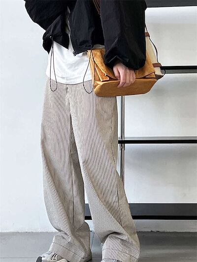 パンツ ワイドパンツ レディース ストライプ柄 春 秋 冬 長ズボン ロング丈 チノパンツ ポケット付き タックパンツ シンプル 柄パンツ 綿 コットン ゆったり 体型カバー ボトムス ストレート 個