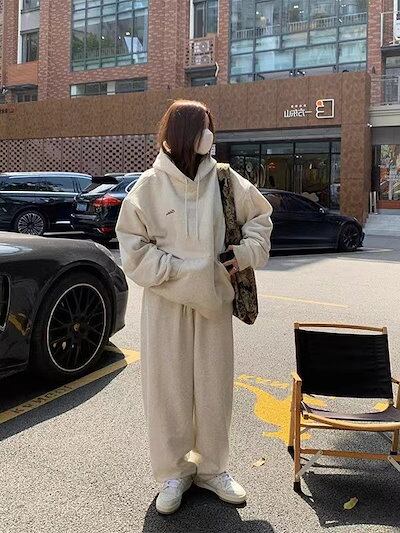 2024 秋冬 2点セット トップス フード付き 羽織り ショート丈 長袖 大人可愛い カジュアル上下ボトムス ストレート系ファッション冬 フル ルーズ サイドゆったりサイズワイドシルエットリラック