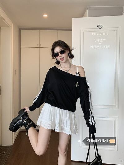 2024 秋冬 トレンド トップス 2WAY 長袖 かわいいTシャツレディース韓国風ロゴ衣装ルーズショートゆったりカジュアルおしゃれサイズスリーブシルエットファッション系サイドシャツフットスポーツ丈