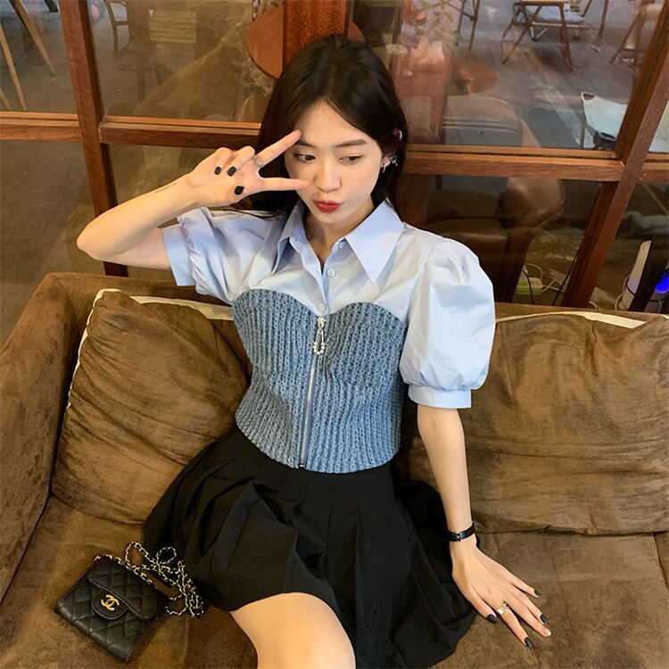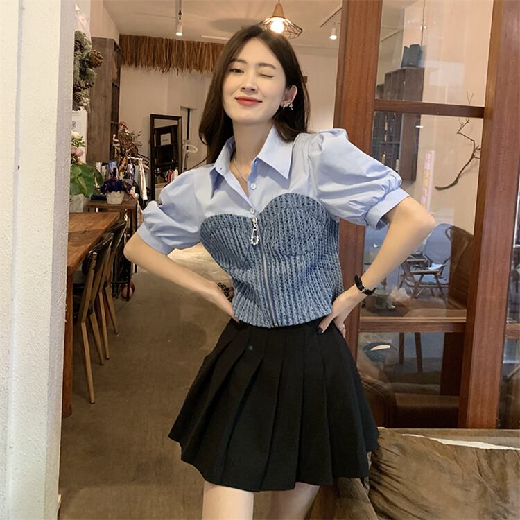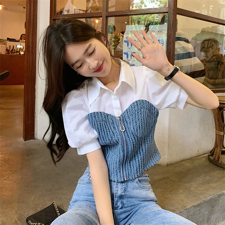 週末限定 デザインセンス 半袖 トップス デニム 縫付 短いスタイル シャツ