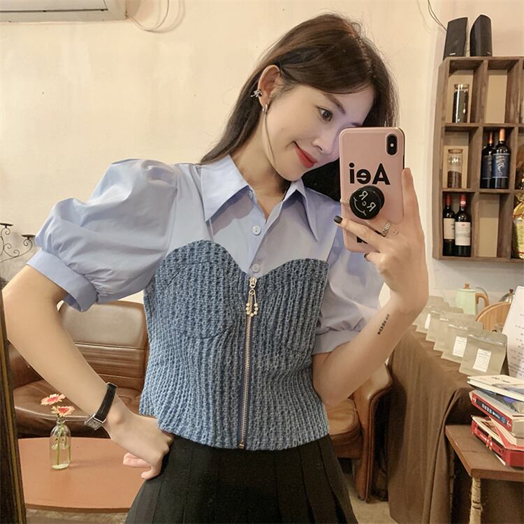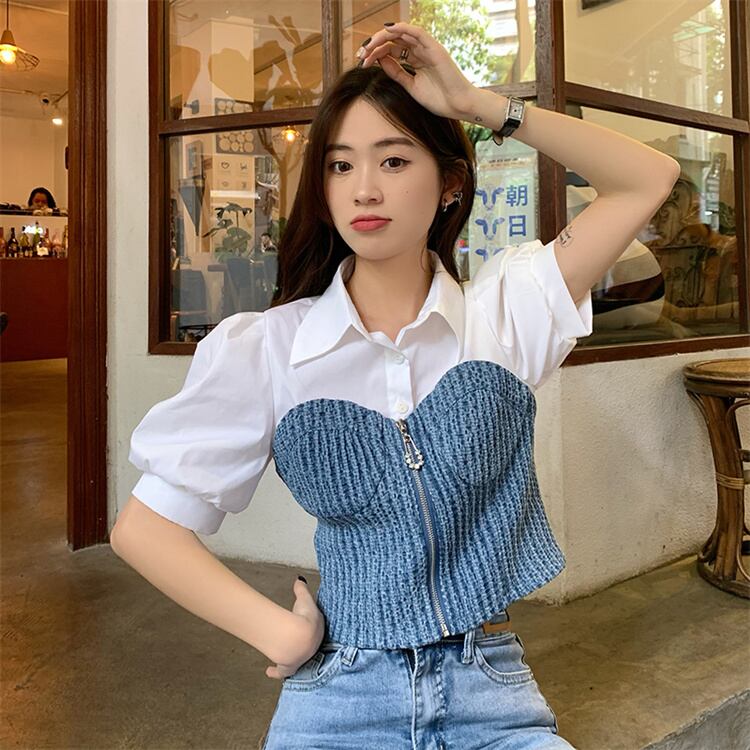 週末限定 INSスタイル デザインセンス 半袖 トップス デニム 縫付 短いスタイル シャツ