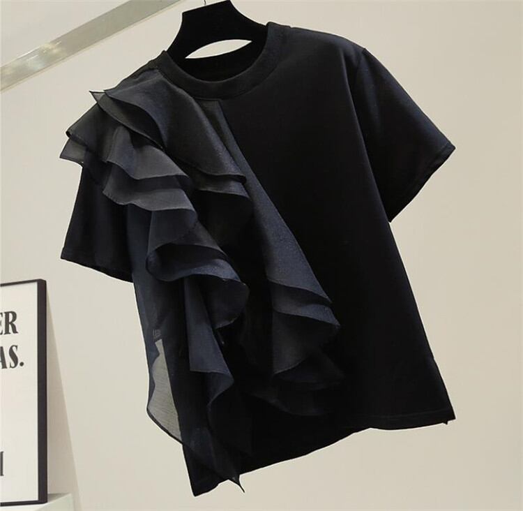 大人気 フリル レイヤード 縫付 半袖 Tシャツ 2022年春 新作 スリム トップス ファッション