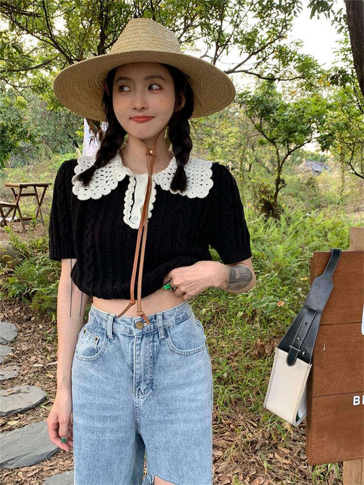 1枚で着映えが狙える INSスタイル 手作り ラペル 半袖 編み物 トップス デザインセンス