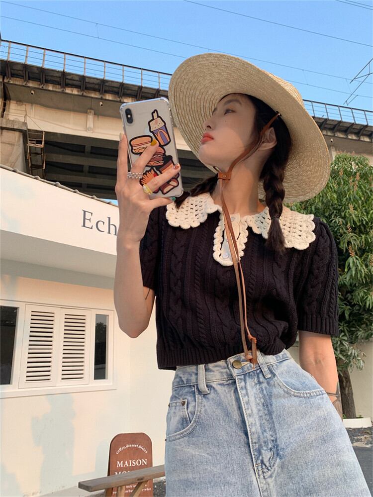 INSスタイル デザインセンス 手作り ラペル 半袖 編み物 トップス