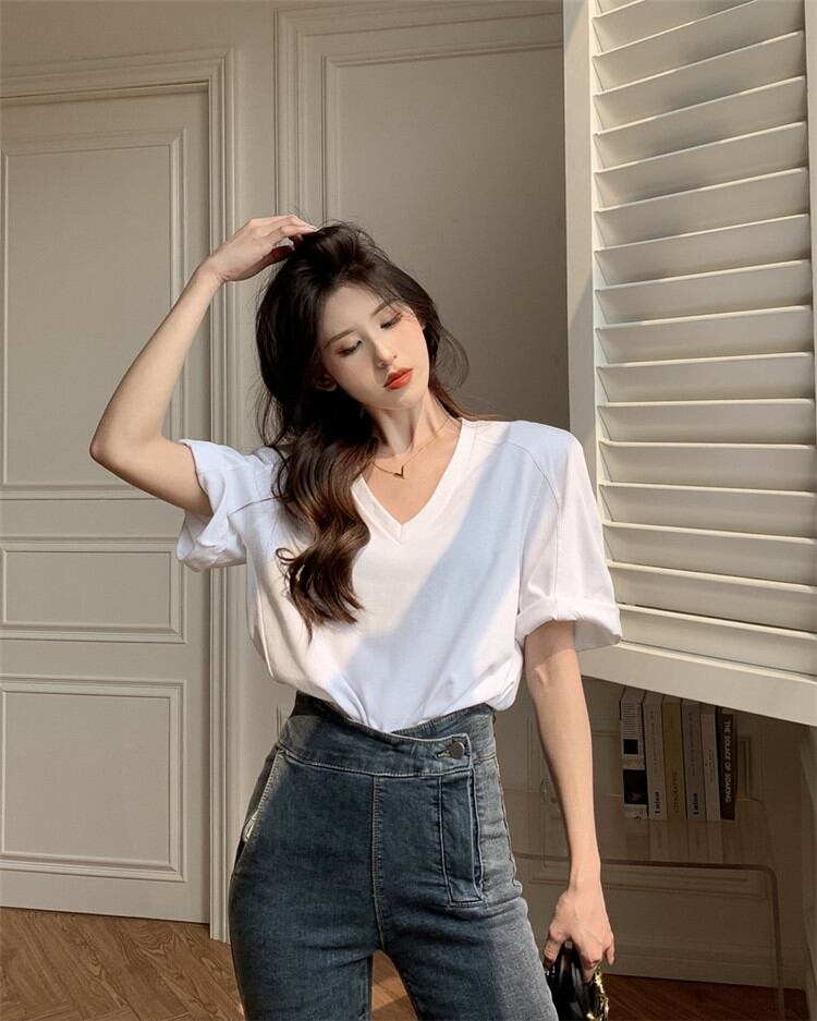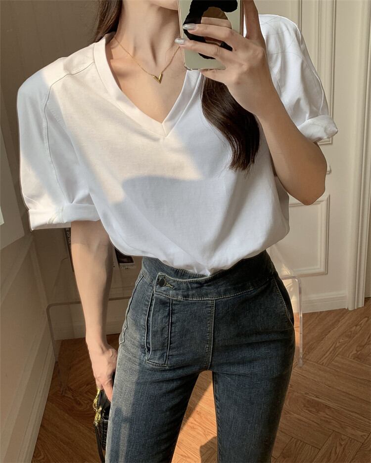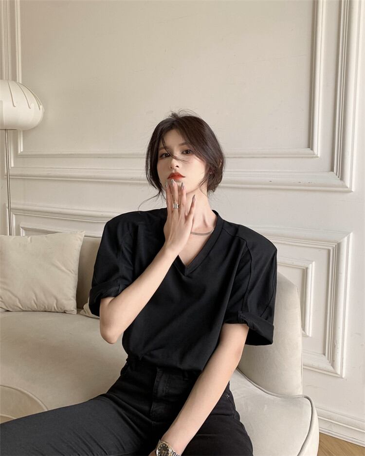 デザインセンス ショルダーパッド ゆったりする 半袖 Tシャツ オシャレ セクシー Vネック トップス