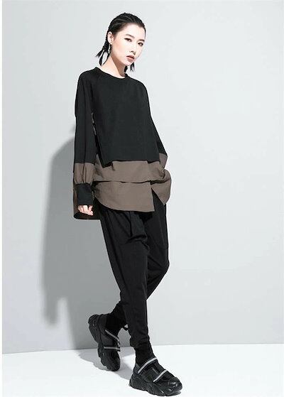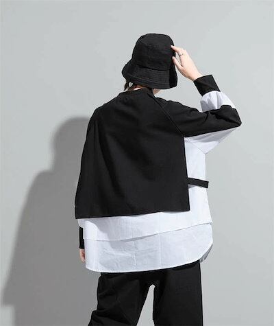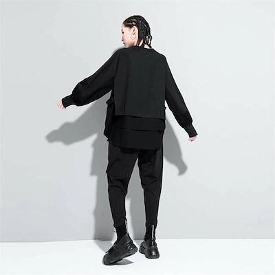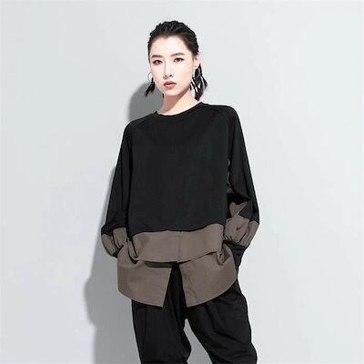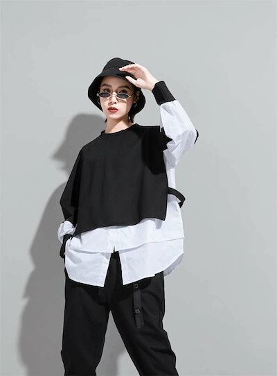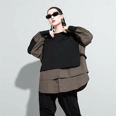パーカー レディース 異素材レイヤード風トップス スウェット レディース 長袖 モード系 個性的 スウェット トレーナー プルオーバー トップス ドッキング フェイクレイヤード 重ね着風 無地 大人