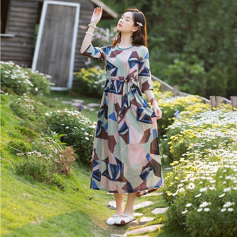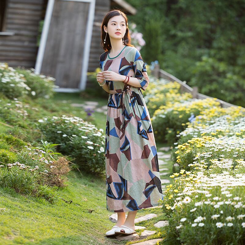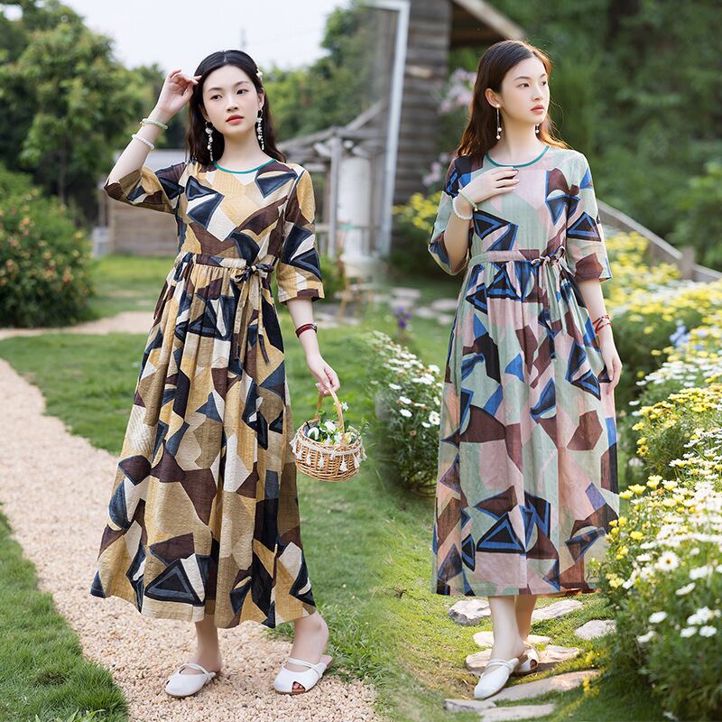 初回送料無料夏新作トップスワンピース綿リネンプリントドレスワンピース