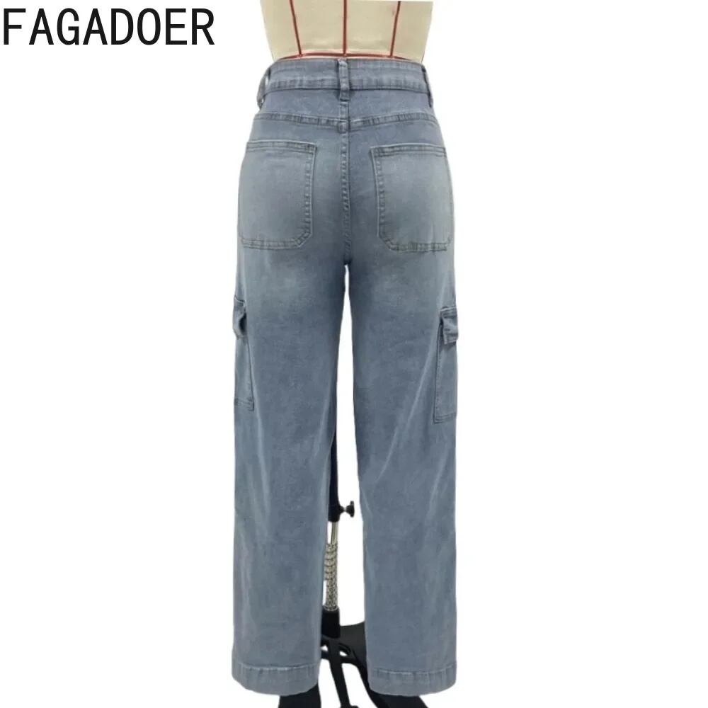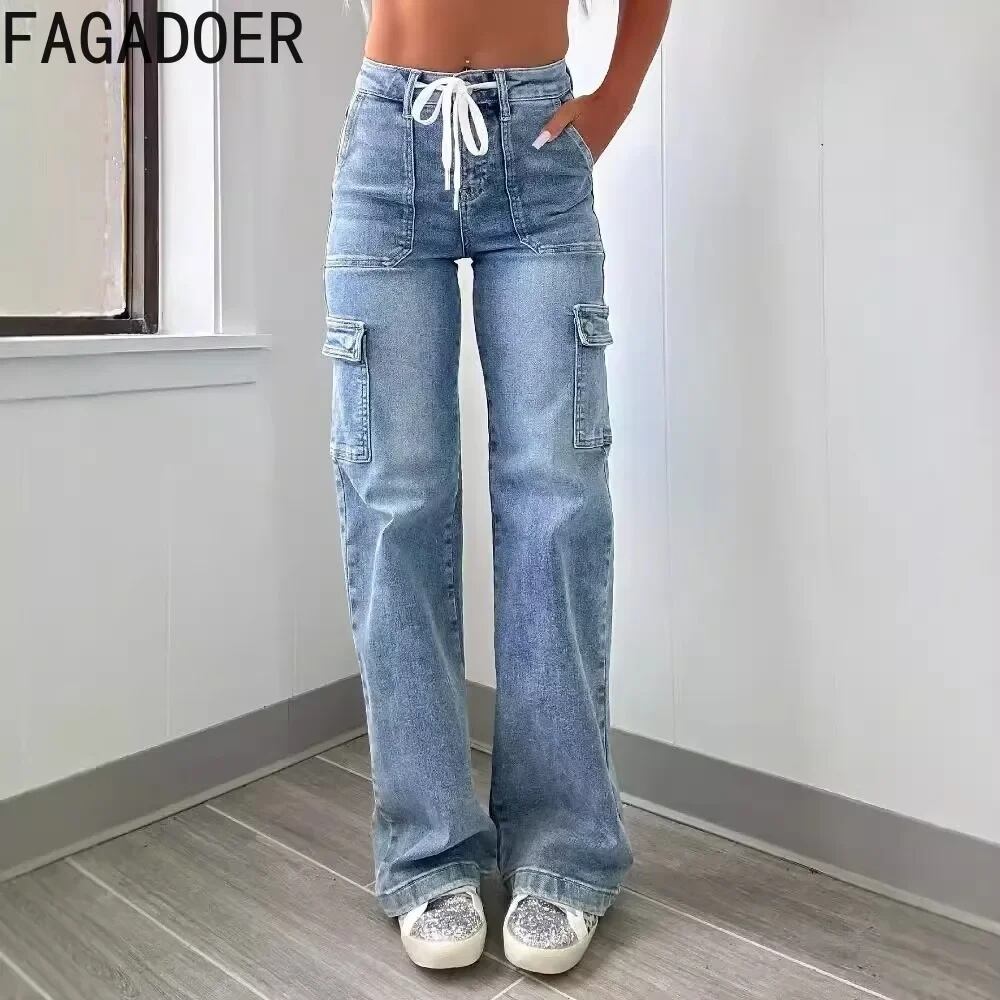 Fagadoer-女性用ブルーデニムカーゴパンツ、ハイウエストストレートジーンズ、女性用ルーズカウボーイボトムス、レースアップポケットストリートウェア、ファッション y2k ボトムス T240831222300_01