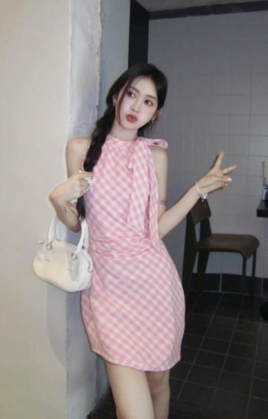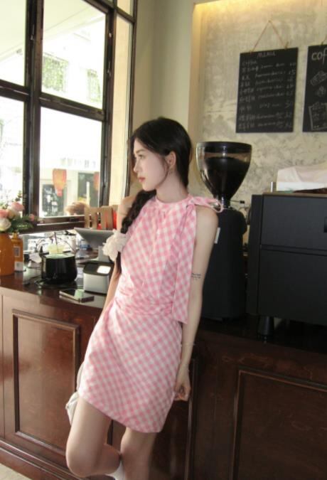 春夏新作 女 レディース ハイウエスト 袖なし チェック柄 ミニ ワンピース ドレス 台型スカート