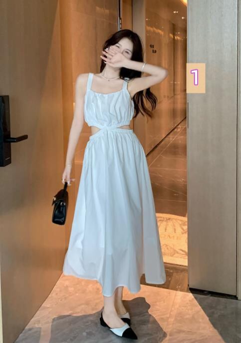 春夏新作 女 レディース ハイウエスト 袖なし 無地 吊りスカート ロング ワンピース 台型スカート 2色