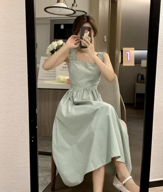 2022春夏新作 女 レディース ハイウエスト 袖なし 無地 吊りスカート ロング ワンピース 台型スカート