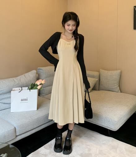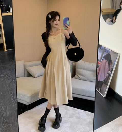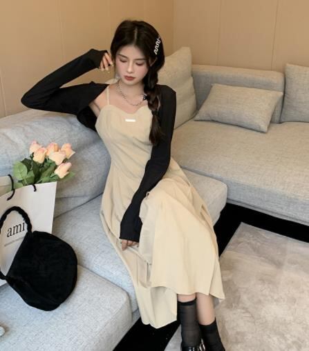 2022春夏新作 女 レディース ハイウエスト 袖なし 無地 吊りスカート ロング ワンピース 台型スカート