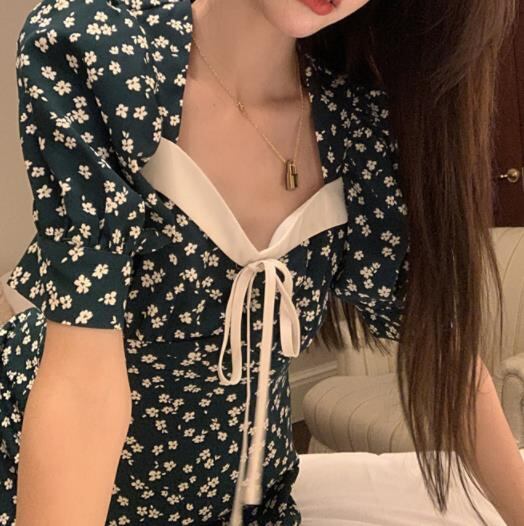 2022春夏新作 女 レディース ハイウエスト 半袖 花柄 ミニ ワンピース ドレス 台型スカート
