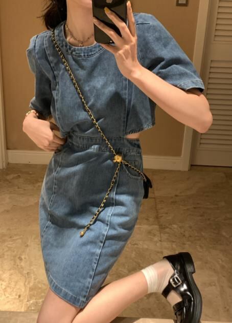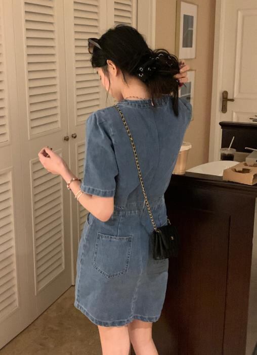 2022春夏新作 女 レディース ハイウエスト 半袖 デニム ミニ ワンピース ドレス 台型スカート S-L