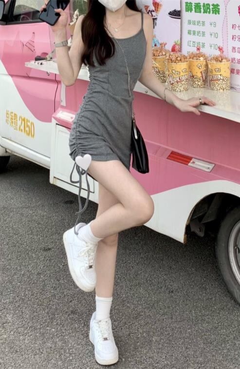 2022春夏新作 女 レディース ハイウエスト 袖なし 無地 吊りスカート ミニ ワンピース ドレス S/M