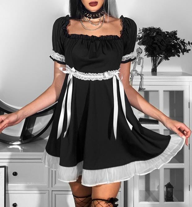 春夏新作 女 レディース 半袖 ハイウエスト パフスリーブ ミニ ワンピース ドレス 台型スカート S-L
