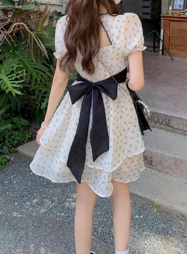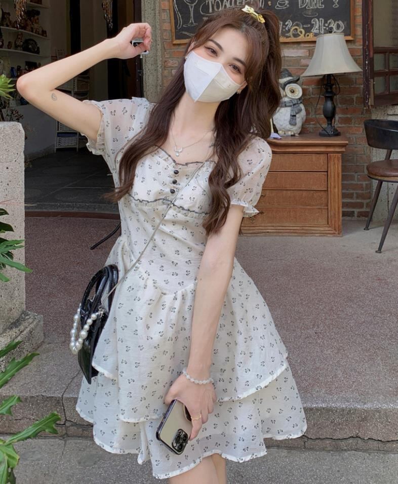 2022春夏新作 女 レディース 半袖 花柄 ハイウエスト ミニ ワンピース ドレス 台型スカート S-L