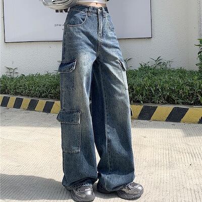2024 春夏パンツ モップパンツ デニム ジーンズ ワイド ストレート ポケット ハイウエスト 脚長効果 美脚効果 細見え ウォッシュ加工 春 水色 カジュアル 韓国ファッション レディース お出か