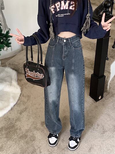 2024 春夏 パンツ デニム ジーンズ ロング丈 ストレート ジーンズ ゆったり ハイウエスト 脚長効果 レッグ美脚効果 細見え 秋 カジュアル ストリート 加工 韓国ファッション お出かけ
