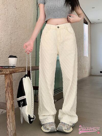 パンツ デニム ジーンズ モップパンツ ジャガード ワイド ストレート ハイウエスト 脚長効果 美脚効果 細見え 春 カジュアル ホワイト 白 韓国ファッション レディース お出かけ