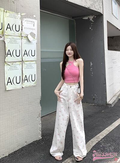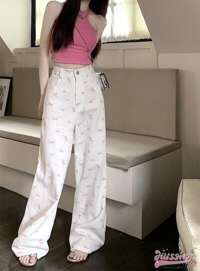 パンツ デニム ジーンズ 花柄 ピンクの花 ワイド ストレート ハイウエスト 脚長効果 美脚効果 細見え 春 白 ホワイト カジュアル 韓国ファッション レディース お出かけ