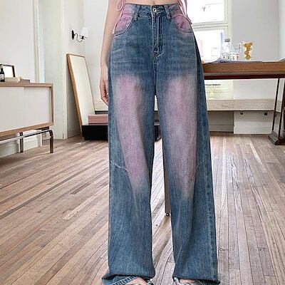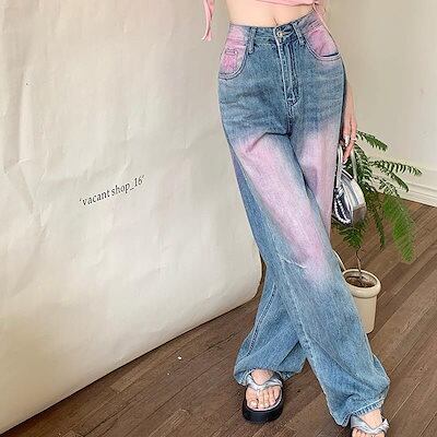 ジーンズ ロング丈 ピンク ワイド ストレート ハイウエスト 脚長 美脚 効果 カジュアル ストリート 韓国ファッション ワイドパンツ レディース