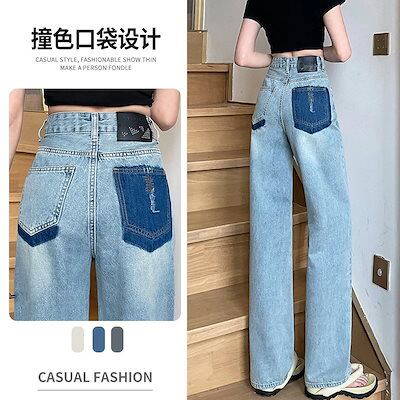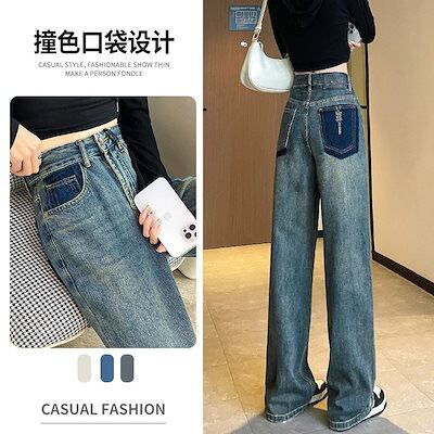 デニムボトムス ジーンズ ストレート 2023春秋 ハイウエスト 米白デザイン感 インパクトカラーワイドパンツ ボトムス レディース 美脚 デニムパンツ