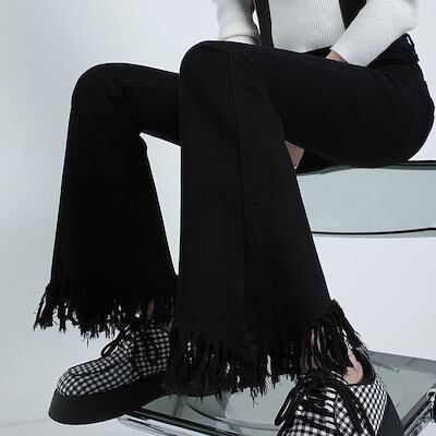 アメリカ ヴィンテージ レディー 春秋 ギャル フレアパンツ 韓版 ハイウエスト スリム フリンジ ジーンズ