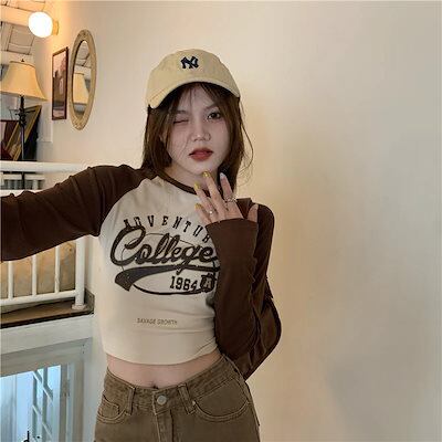 2024春夏 トップス 長袖 可愛い おしゃれ フィット ラウンドカラー 重ね着丈 スリーブ 女っぽ Tファッション フェミニン きれいめ 色っぽ プリント