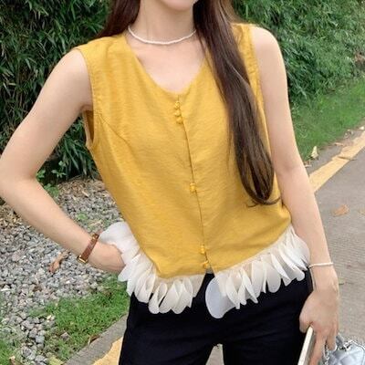 2024 春夏トップス シャツ ノースリーブ ボタン ラウンドネック フリル ゆったり 細見え 夏 黄色 イエロー おしゃれ かわいい 韓国ファッション レディース お出かけ