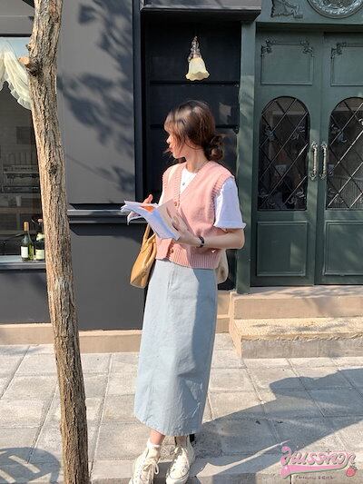 スカート デニム生地 ミディアム丈 スリット バックオープン ハイウエスト 脚長効果 美脚効果 細見え 春 白 水色 紺色 かわいい おしゃれ カジュアル 韓国ファッション レディース お出かけ
