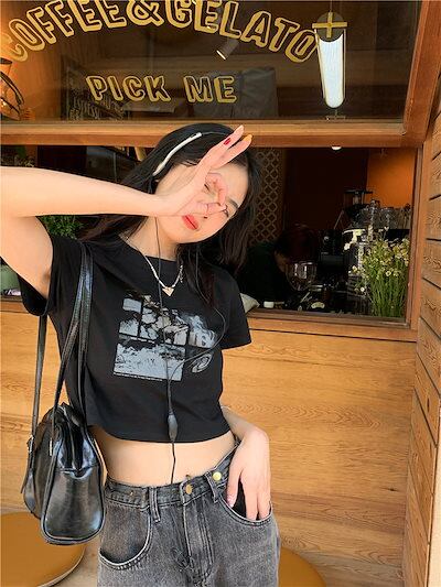 2024 春夏 甘い トップス Tシャツ ラウンドネック 休日 ファッション スリムフィット丈短め ショートサイズスリーブ レディース へそ出しシルエット 韓国 休日 おしゃれ T