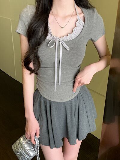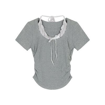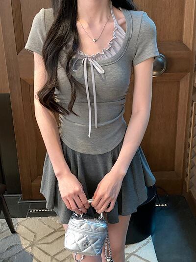 2024春夏 ツーピース トップス レイヤード風 キャミソール tシャツ 重ね着風 カットソー インナー ショート長袖 タイト フィット T カジュアル きれいめ フェミニンフレンチモックネック