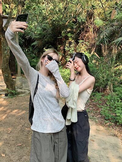 2024 春 透け感UP tシャツ ファッション 韓国 トップス デザイン カットソー イラストエンジェル 長袖丈パンツ
