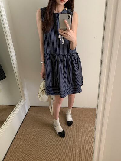 2024 夏 韓国ワンピース ミニ丈 Aライン ストライプ ラウンドネック ノースリーブ ハイウエスト 美脚効果 脚長効果 細見え 夏 おしゃれ かわいい キュート ガーリー 韓国ファッション レディ