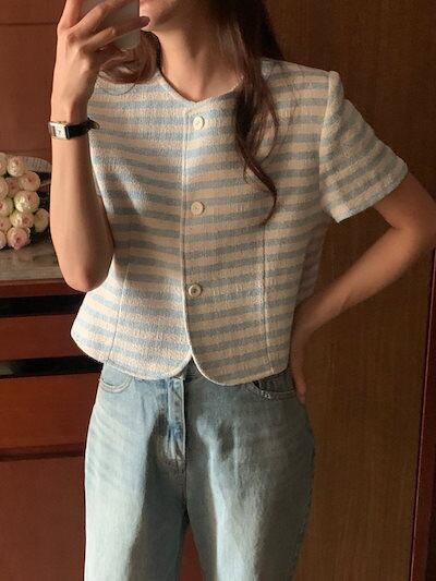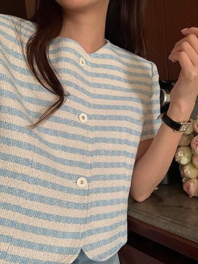 2024秋冬アウター ジャケット ラウンドネック ボーダー 半袖 ボタン 秋 黒 青 水色 ライトブルー おしゃれ かわいい 韓国ファッション レディース お出かけ