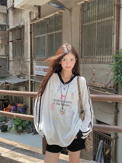 2024 秋冬 トップス 長袖 かわいいVネック Tシャツ レディース 韓国風 ロゴ衣装ルーズ ゆったりカジュアルおしゃれサイズスリーブシルエットファッション系サイドシャツフットスウエット春