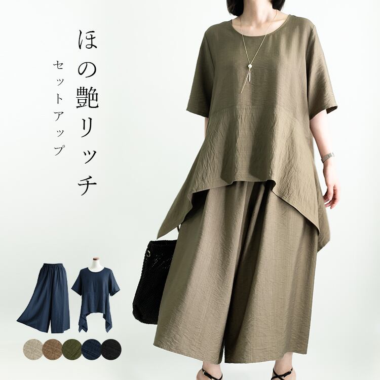 ほの艶レーヨン混ワッシャー セットアップ(トップス+パンツ2点セット) レディース ファッション 大人