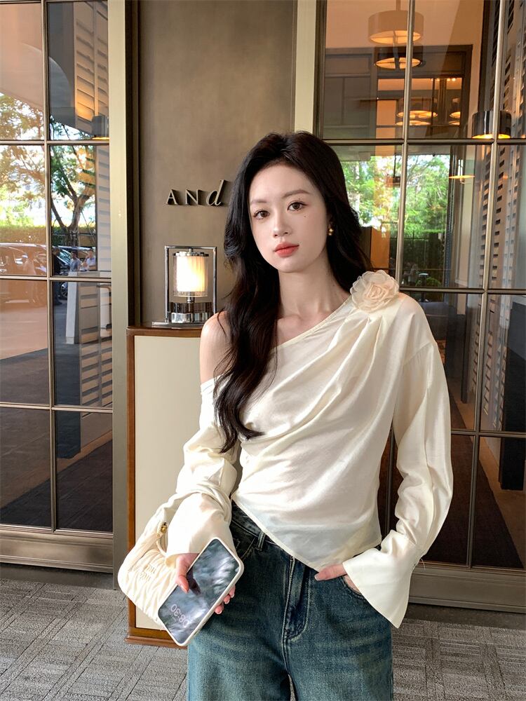 芸能人も好きな服を着ます 韓国ファッション 斜め肩の服 お出かけ 半袖 sweet系 上着 シャツ ブラウス