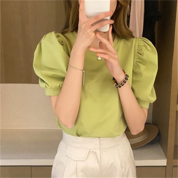 待望の再入荷です ブラウス 上着 スリム 半袖 Tシャツ 綿 夏 ハイウエスト ランタンスリーブ カジュアル