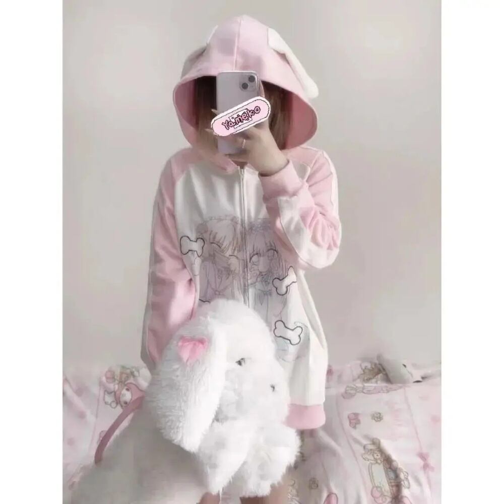 女の子のためのジッパー付き日本のフード付きパーカー、女性のためのカワイイルーズパーカー、黒と白のコート、トレンディでカワイイ、冬と秋 パーカー ジャージ y2k T240908200651_02