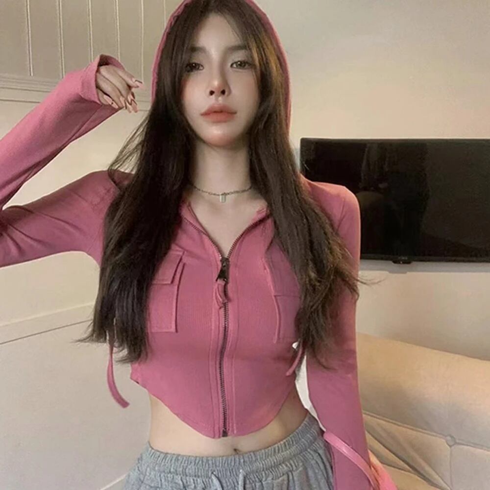 女性用Y2K-Zipアップクロップパーカー、長袖、巾着、スリムフィットスウェットシャツ、クロップドフードトップス、ピンク パーカー ジャージ y2k T240908200746_04