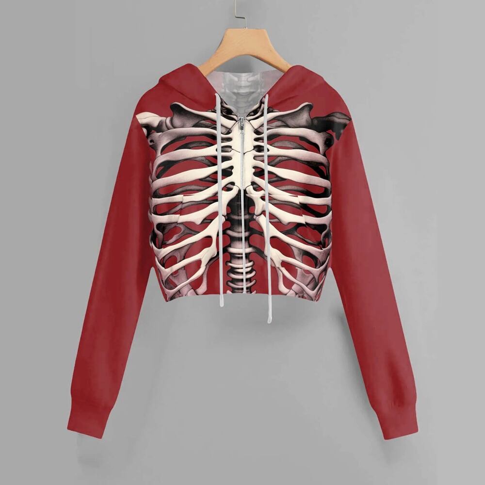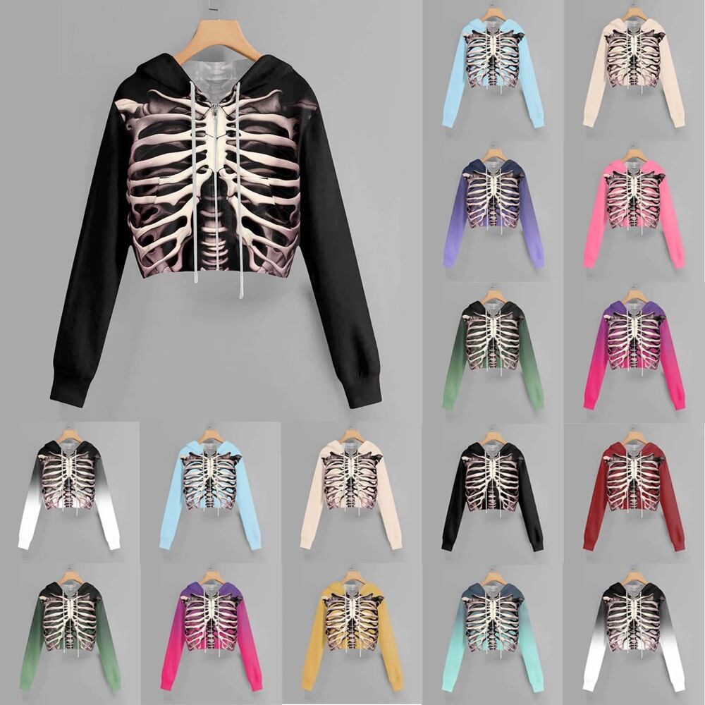 女性用ハロウィンスカルプリントクロップドパーカー、長袖トップス、フルジップフード付きスウェットシャツ、ゴシックストリートウェア、y2k服 パーカー ジャージ y2k T240908201714_01