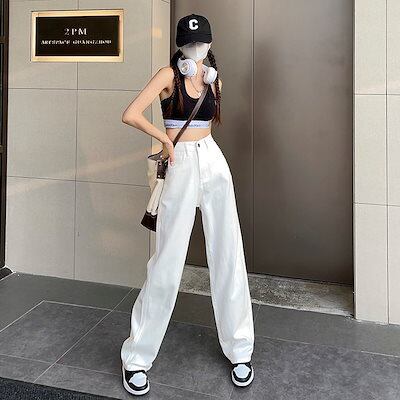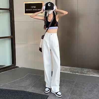 即納ホワイト ワイドパンツ レディース ハイウェスト 春 着痩せ ストレートパンツ ジーンズ