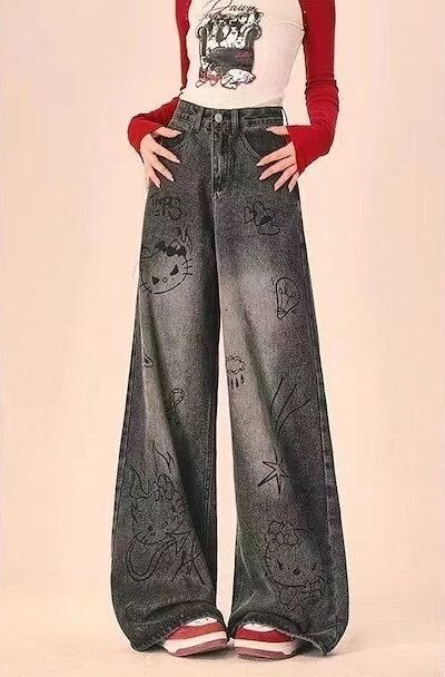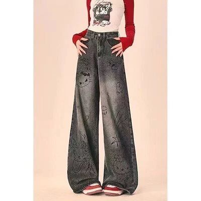 アメリカ ヴィンテージ レディース 2025 春 デザインセンス ジーンズ ワイドレッグパンツ ニッチ 落書き ハイウエスト ゆったり Kitty ワイドパンツ