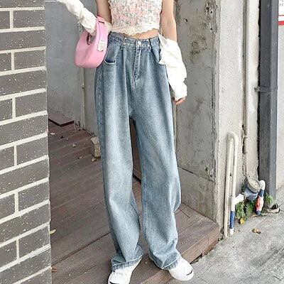 ワイドパンツ 2024新作 百掛け ライトブルー ジーンズ 着痩せ ストレート ワイドパンツ